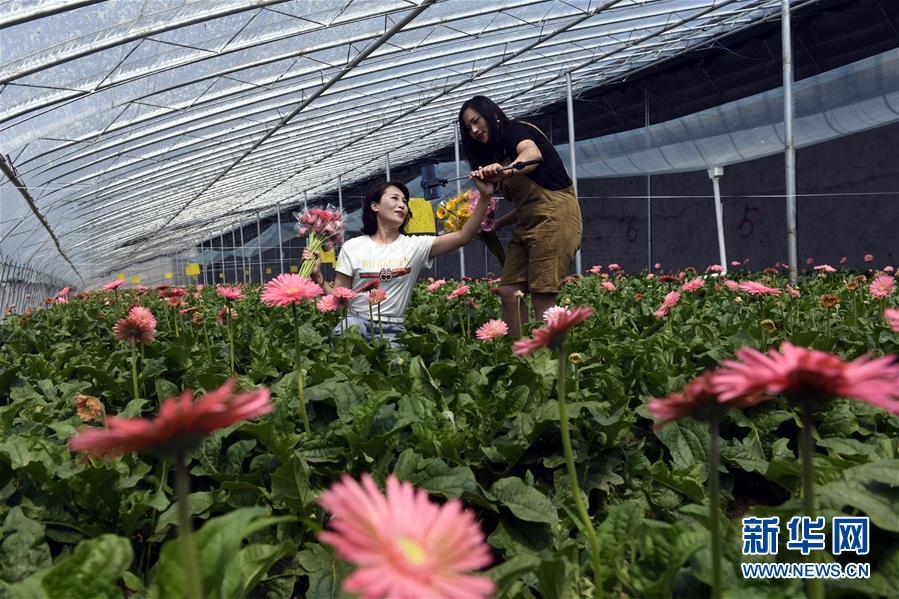 7月10日,在莒縣招賢鎮(zhèn)西黃埠村盛世花卉種植專業(yè)合作社,駐村第一書記鐘翠娟(左)在扶郎花種植大棚進(jìn)行網(wǎng)上直播。山東省日照市莒縣招賢鎮(zhèn)有20余年的玫瑰花、扶郎花種植歷史。目前,招賢鎮(zhèn)投資建設(shè)的高標(biāo)準(zhǔn)特色鮮花種植大棚可年產(chǎn)700-800萬枝優(yōu)質(zhì)玫瑰和扶郎花等,帶動(dòng)周邊鄉(xiāng)鎮(zhèn)的建檔立卡貧困戶脫貧增收。新華社記者 范長國 攝