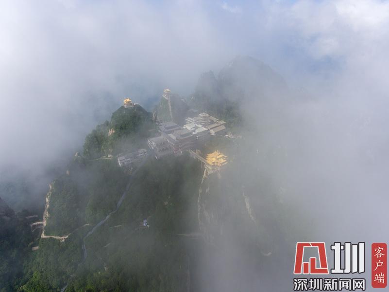 在海拔2217米的山頂上,矗立著3座明清皇家宮殿建筑風格的建筑,山峰高聳、山谷深不見底,這些建筑群宛如“漂浮”在云端,巧奪天工,似人間仙境。