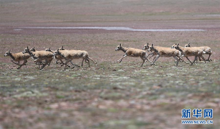 7月7日在可可西里卓乃湖區(qū)域拍攝的一群藏羚羊。目前正值藏羚羊產(chǎn)仔季。來自青海三江源、新疆阿爾金山、西藏羌塘等地的藏羚羊來到位于青海省可可西里腹地、被譽為“藏羚羊大產(chǎn)房”的卓乃湖區(qū)域產(chǎn)仔。新華社記者 薛玉斌 攝