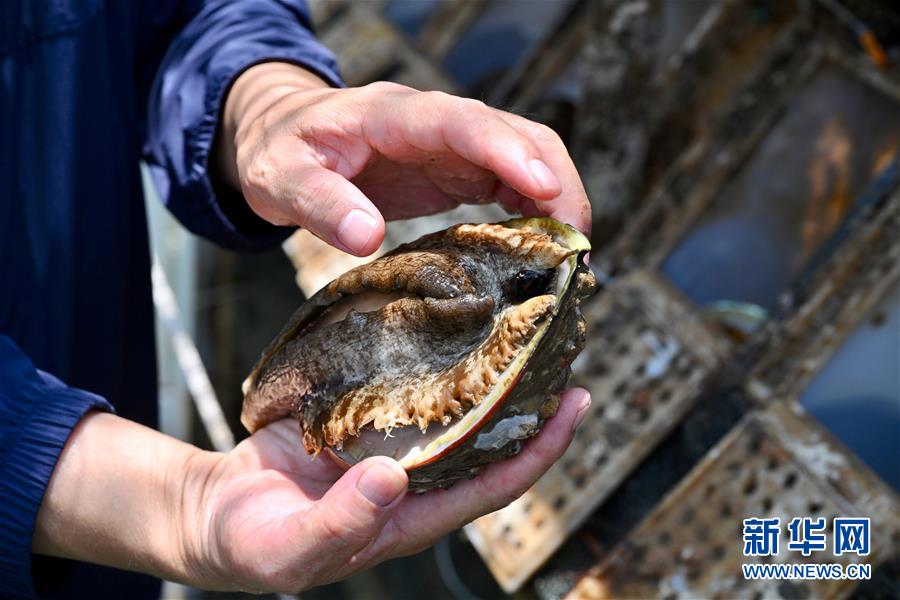 7月14日,在福建省連江縣深遠海養(yǎng)殖平臺“福鮑一號”上,工作人員展示長勢良好的鮑魚。新華社記者 姜克紅 攝