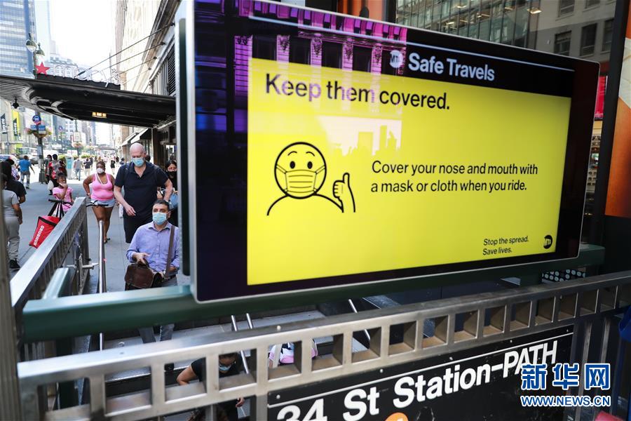 7月14日,人們佩戴口罩進入美國紐約地鐵站。美國約翰斯·霍普金斯大學:截至北京時間15日6時34分,全球新冠確診病例達13258016例,死亡病例為576752例。美國是全球疫情最嚴重的國家,確診病例達3416222例,死亡病例為136319例。新華社記者 王迎 攝