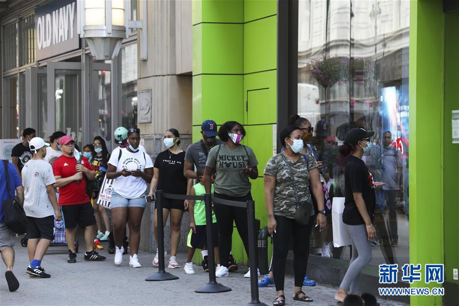 7月14日,人們在美國紐約排隊等待進店購物。美國約翰斯·霍普金斯大學:截至北京時間15日6時34分,全球新冠確診病例達13258016例,死亡病例為576752例。美國是全球疫情最嚴重的國家,確診病例達3416222例,死亡病例為136319例。新華社記者 王迎 攝