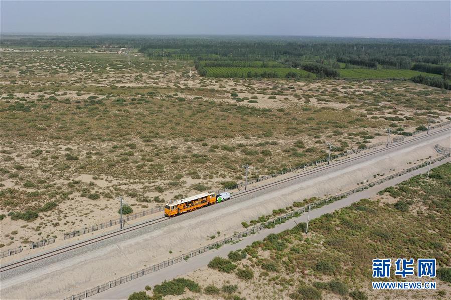 鋼軌打磨車在臺特瑪湖特大橋上作業(yè)(7月14日攝,無人機(jī)照片)。新華社記者 丁磊 攝