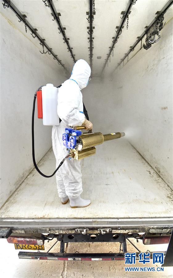 7月15日,北京二商肉類食品集團(tuán)有限公司員工對冷鏈運(yùn)輸設(shè)備進(jìn)行消毒。北京二商肉類食品集團(tuán)有限公司是保障北京肉類市場供應(yīng)的主要企業(yè)之一。新冠肺炎疫情以來,企業(yè)嚴(yán)格實(shí)施北京市、農(nóng)業(yè)農(nóng)村部和中國肉類協(xié)會的防疫要求,對進(jìn)入廠區(qū)的人員、車輛以及原料采購、屠宰分割、產(chǎn)品加工、貯藏運(yùn)輸、廢棄物收集及污水處理等生產(chǎn)環(huán)節(jié)嚴(yán)格防疫,強(qiáng)調(diào)源頭把關(guān)徹底消毒。目前,集團(tuán)公司下屬多家生豬屠宰加工基地正常運(yùn)營,保質(zhì)保量供應(yīng)北京市場需求。新華社記者 李欣 攝