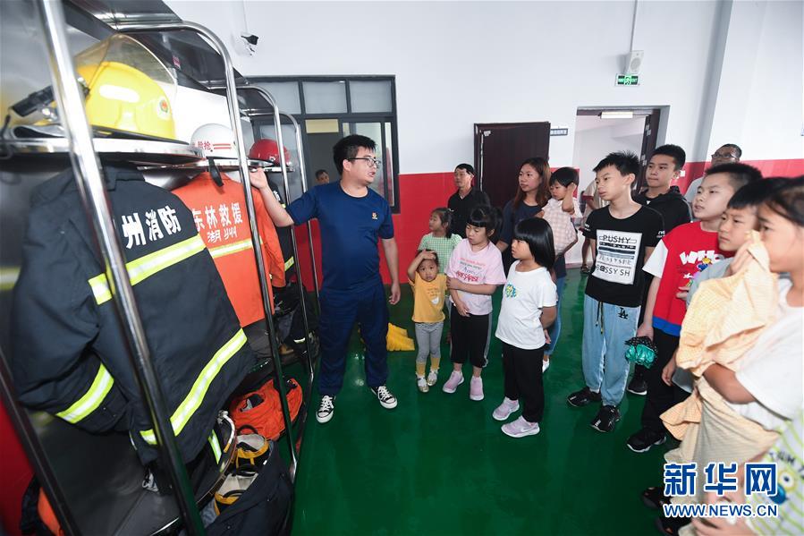 7月16日,東林鎮(zhèn)消防綜合應(yīng)急救援隊(duì)隊(duì)員在給學(xué)生們介紹消防服及消防器材。當(dāng)日,浙江省湖州市吳興區(qū)東林鎮(zhèn)舉辦暑期“安全防護(hù)小超人”主題活動(dòng)?;顒?dòng)由醫(yī)護(hù)人員、消防隊(duì)員等為學(xué)生及家長(zhǎng)講授日常安全避險(xiǎn)及溺水急救知識(shí),中小學(xué)們還在現(xiàn)場(chǎng)學(xué)習(xí)了簡(jiǎn)易包扎、心肺復(fù)蘇的正確方式,并了解滅火器、滅火毯等消防器材的使用,為學(xué)生平安過(guò)暑期打好安全防護(hù)“預(yù)防針”。新華社記者 徐昱 攝