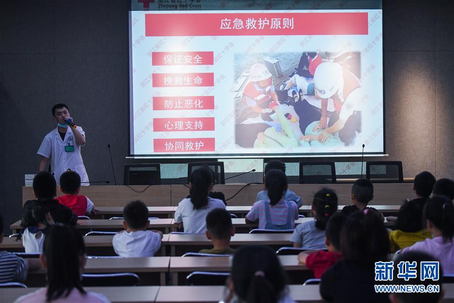 7月16日,東林鎮(zhèn)衛(wèi)生院的醫(yī)護(hù)人員(左一)在給學(xué)生們上應(yīng)急救護(hù)課。當(dāng)日,浙江省湖州市吳興區(qū)東林鎮(zhèn)舉辦暑期“安全防護(hù)小超人”主題活動(dòng)。活動(dòng)由醫(yī)護(hù)人員、消防隊(duì)員等為學(xué)生及家長(zhǎng)講授日常安全避險(xiǎn)及溺水急救知識(shí),中小學(xué)們還在現(xiàn)場(chǎng)學(xué)習(xí)了簡(jiǎn)易包扎、心肺復(fù)蘇的正確方式,并了解滅火器、滅火毯等消防器材的使用,為學(xué)生平安過(guò)暑期打好安全防護(hù)“預(yù)防針”。新華社記者 徐昱 攝