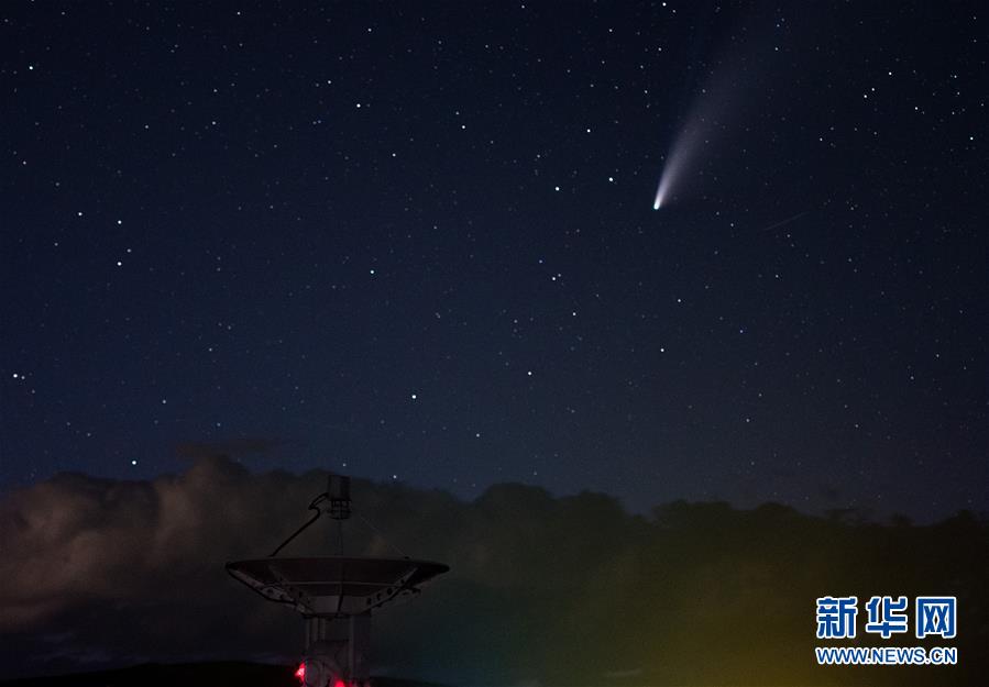 7月18日晚,在明安圖觀測基地,尼歐懷茲彗星劃過天際。7月18日晚至19日凌晨,在位于內蒙古錫林郭勒盟正鑲白旗境內的國家天文臺明安圖觀測基地,尼歐懷茲彗星劃過天際。在明安圖觀測基地內,排列著100面白色的拋物面天線。這個龐大的天線陣列便是草原“天眼”——明安圖射電頻譜日像儀。草原“天眼”持續(xù)接收太陽射電輻射,然后由科研人員進行數(shù)據分析研究,對空間環(huán)境監(jiān)測、太陽活動預報均有重要作用。新華社記者連振攝