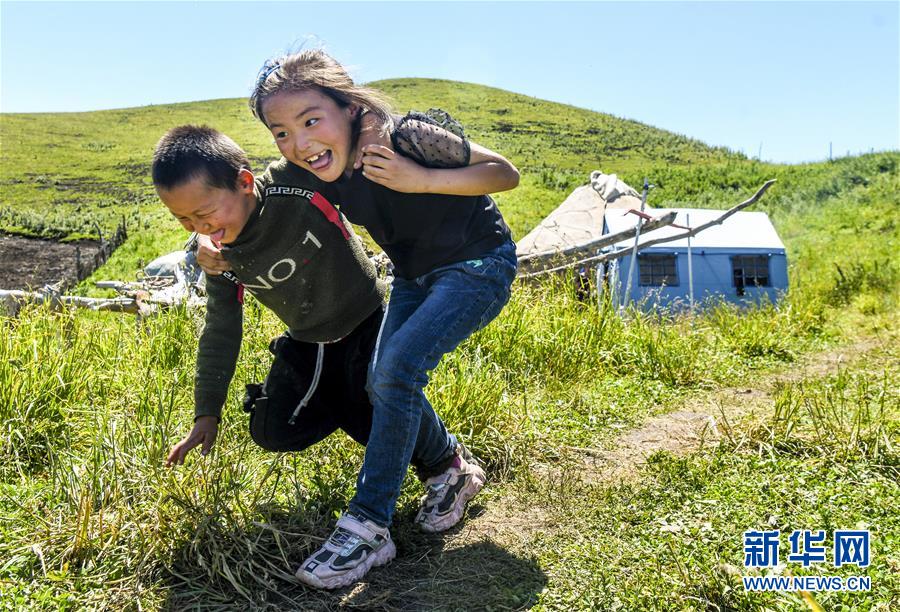 在新疆伊犁特克斯縣境內(nèi)的夏牧場(chǎng)里,兩名小朋友在玩耍(7月2日攝)。新華社記者王菲攝