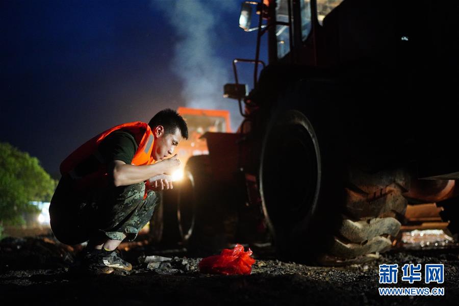 李群群在車(chē)輛旁邊的泥地上吃晚飯(7月10日攝)。來(lái)自山東的李群群是中國(guó)安能第二工程局南昌公司的一名裝載機(jī)操作手,之所以稱(chēng)同事為“戰(zhàn)友”,是因?yàn)樗诘闹袊?guó)安能建設(shè)集團(tuán)轉(zhuǎn)制前是每逢搶險(xiǎn)救援都沖在一線的武警水電部隊(duì)。江西省鄱陽(yáng)縣問(wèn)桂道圩堤決口后,李群群和大部隊(duì)緊急趕到封堵現(xiàn)場(chǎng)開(kāi)始作業(yè)。新華社記者周密攝