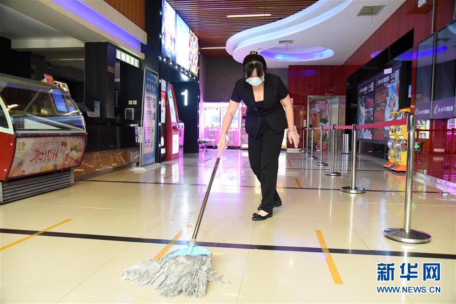 7月20日,濟南新世紀(jì)電影城陽光100店的員工在對影院設(shè)施進行消殺。當(dāng)日,山東濟南市部分電影院在嚴(yán)格防控疫情的基礎(chǔ)上陸續(xù)恢復(fù)開放。新華社記者王凱攝