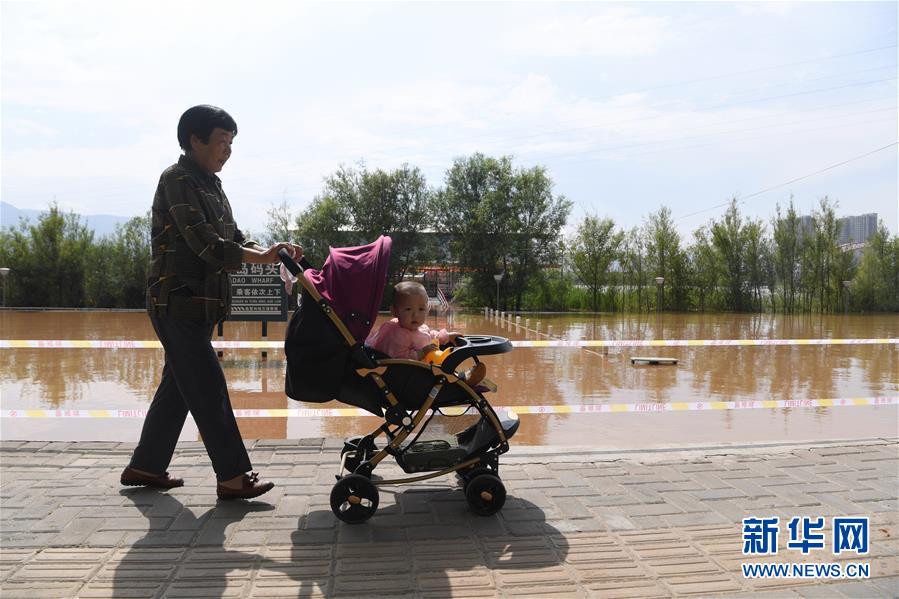 7月21日,在甘肅省臨夏回族自治州永靖縣黃河岸邊,一名推著嬰兒車的市民從警戒線旁走過。新華社記者陳斌攝