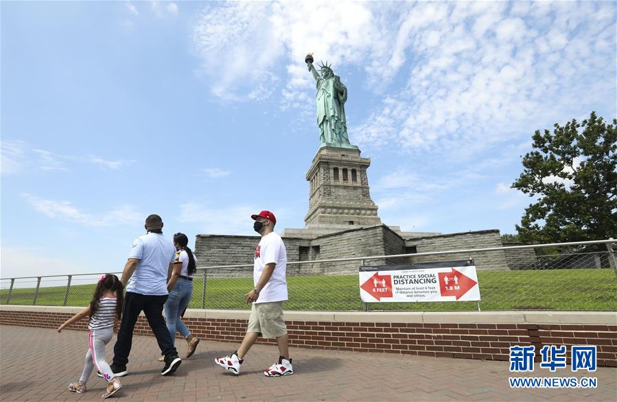 7月20日,參觀者在美國紐約自由島游覽。美國紐約市20日繼續(xù)推進(jìn)經(jīng)濟(jì)重啟計劃,宣布開始進(jìn)入解封新階段,進(jìn)一步允許部分低風(fēng)險文娛活動重啟。自由女神像所在的自由島對公眾開放,但雕像內(nèi)部和博物館仍關(guān)閉。新華社記者王迎攝