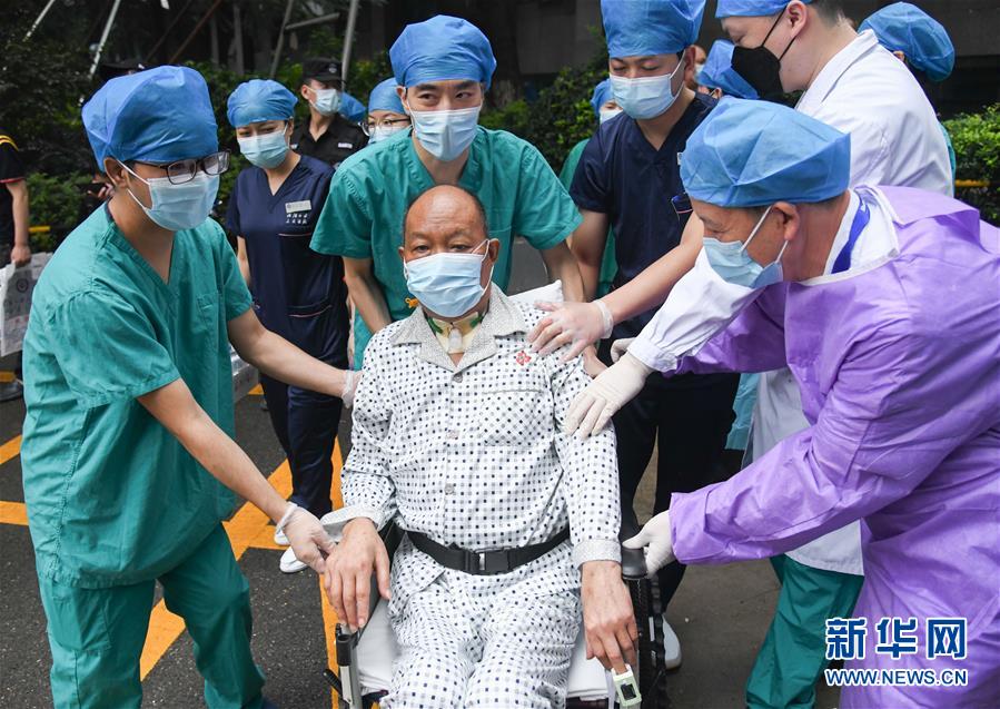 7月21日,武漢大學人民醫(yī)院醫(yī)護人員護送崔先生出院。新華社記者程敏攝