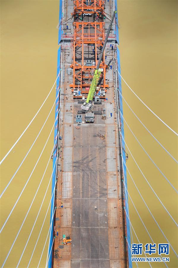 7月22日,廣州南沙港鐵路跨西江特大斜拉橋在進(jìn)行最后一組斜拉索吊裝。新華社記者劉大偉攝