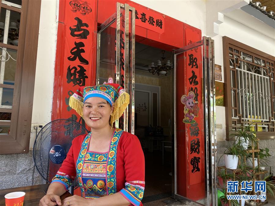 廣西恭城瑤族自治縣蓮花鎮(zhèn)紅巖村村民楊燕紅在家門口向客人推銷本地特產(chǎn)(7月16日攝)。新華社記者林凡詩攝