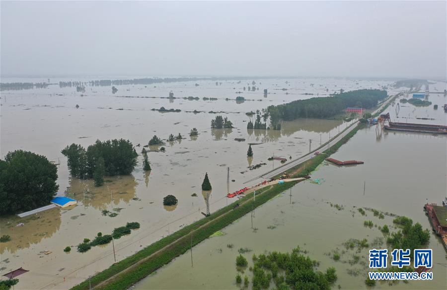 這是7月21日拍攝的被淹的南京市高淳區(qū)陽江鎮(zhèn)勝利圩(畫面左側(cè))(無人機(jī)照片)。新華社記者季春鵬攝