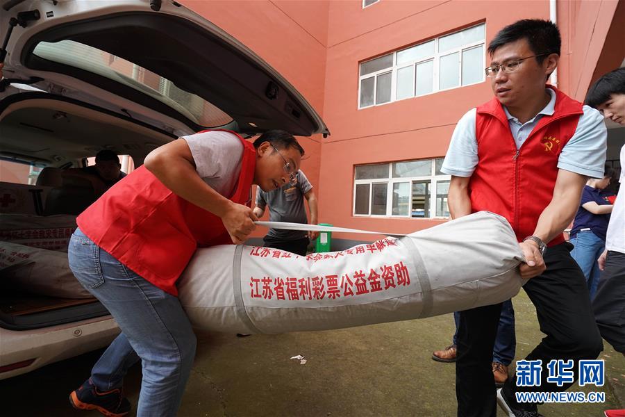 7月23日,工作人員在盱眙縣鮑集小學(xué)安置點搬運帳篷。當日,受淮河盱眙段水位上漲影響,江蘇省淮安市盱眙縣啟動鮑集圩行洪區(qū)萬余名群眾撤離轉(zhuǎn)移工作,確保安全度汛。新華社記者韓瑜慶攝