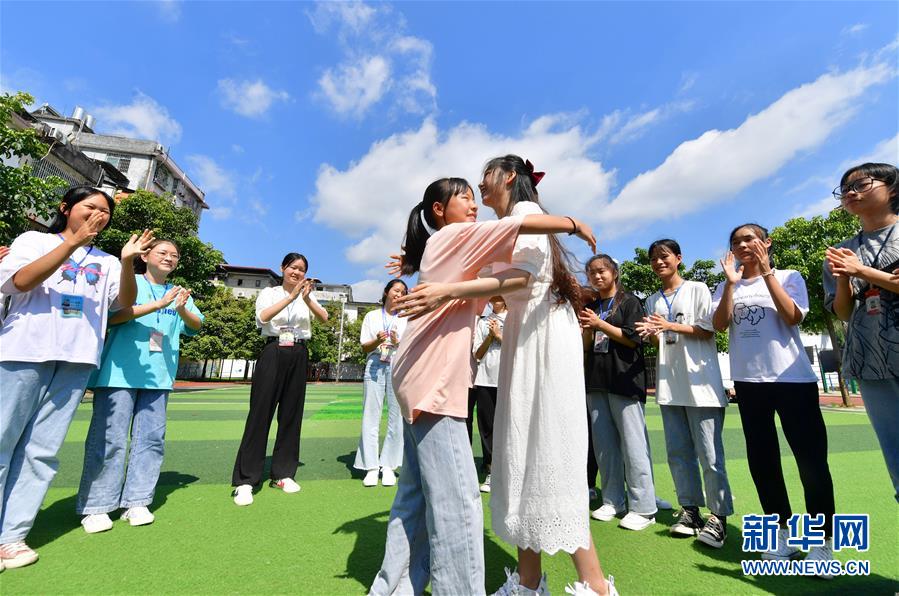 在融水苗族自治縣?;钢袑W(xué)1813班舉辦的送別班會(huì)上,支教老師林洋港(中右)和同學(xué)們擁抱告別(7月23日攝)。新華社記者黃孝邦攝