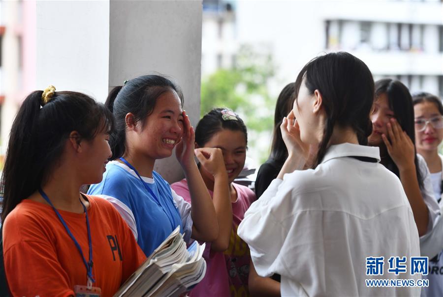 在融水苗族自治縣民族中學(xué)1818班舉辦的送別班會上,同學(xué)們與支教老師高潔(前右)道別(7月23日攝)。新華社記者黃孝邦攝