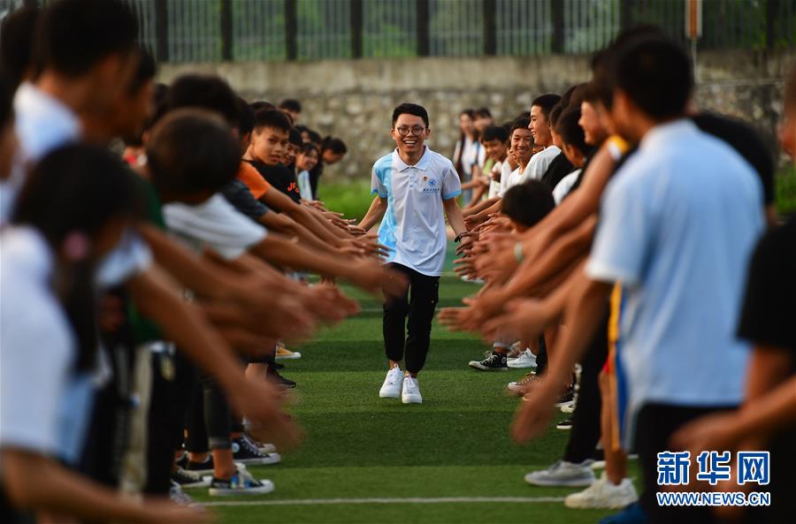 在融水苗族自治縣思源實驗學(xué)校舉辦的支教團送別晚會上,支教老師溫昌浩(中)接受同學(xué)們的祝福(7月22日攝)。新華社記者黃孝邦攝