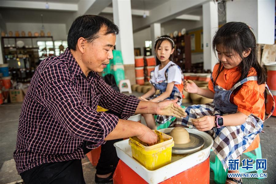 母先才在陶藝體驗館里教小游客如何使用陶藝拉坯機(7月14日攝)。新華社記者 陶亮 攝