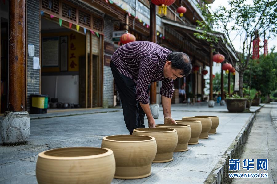 母先才將制好的陶坯放到室外風(fēng)干(7月14日攝)。新華社記者 陶亮 攝