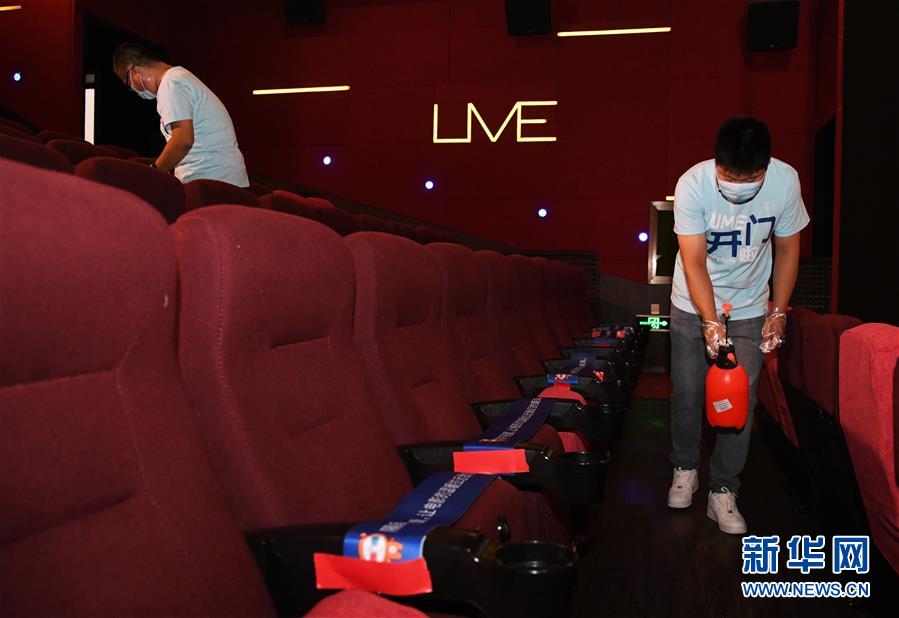 7月24日,在UME影城北京華星店1號影廳,工作人員進(jìn)行消殺清潔工作。當(dāng)日,在做好新冠肺炎疫情防控的前提下,北京市部分電影院有序恢復(fù)開放。新華社記者 任超 攝