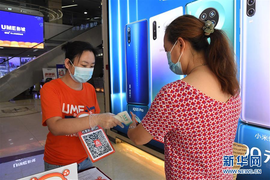 7月24日,在UME影城北京華星店,工作人員(左)為觀(guān)眾測(cè)量體溫。當(dāng)日,在做好新冠肺炎疫情防控的前提下,北京市部分電影院有序恢復(fù)開(kāi)放。新華社記者 任超 攝