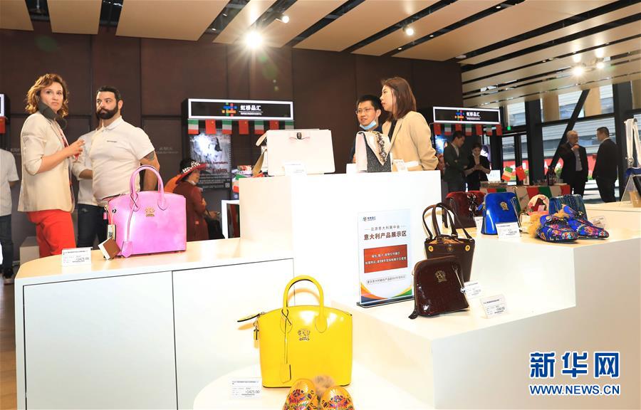 2020年5月8日,虹橋品匯國(guó)別文化節(jié)云游意大利主題展在上海虹橋進(jìn)口商品展示交易中心舉行,參觀(guān)者從展覽上一個(gè)意大利皮具展示臺(tái)前走過(guò)。新華社記者 方喆 攝