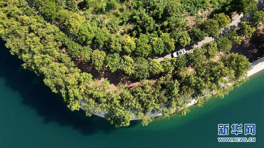 7月26日,汽車行駛在欒卸村的樹林里(無人機(jī)照片)。盛夏,位于太行山區(qū)的河北省沙河市欒卸村滿目蔥蘢,山水、田園、民居構(gòu)成一幅美麗鄉(xiāng)村圖景。新華社記者 牟宇 攝