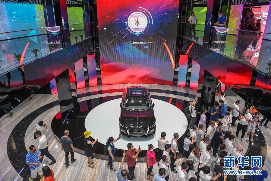 7月28日,參觀者參觀紅旗創(chuàng)新大廈內(nèi)展出的紅旗H9轎車。