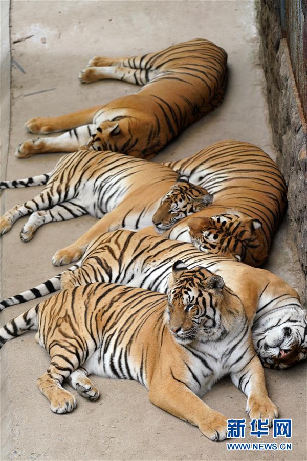 7月28日,在橫道河子?xùn)|北虎林園,東北虎在休息。時值盛夏,位于黑龍江省海林市的橫道河子?xùn)|北虎林園的東北虎活動量減少,以不同方式消夏納涼。新華社記者王建威攝