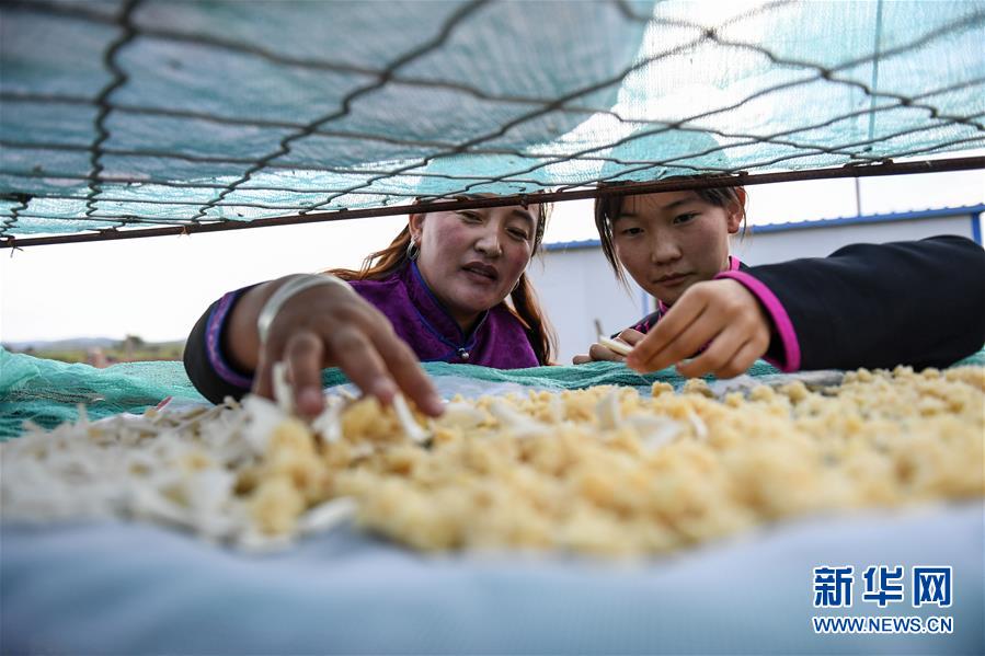 呼格吉勒的妻子薩如拉(左)和女兒蘇日娜在院落里晾曬奶食品(7月23日攝)。新華社記者劉磊攝