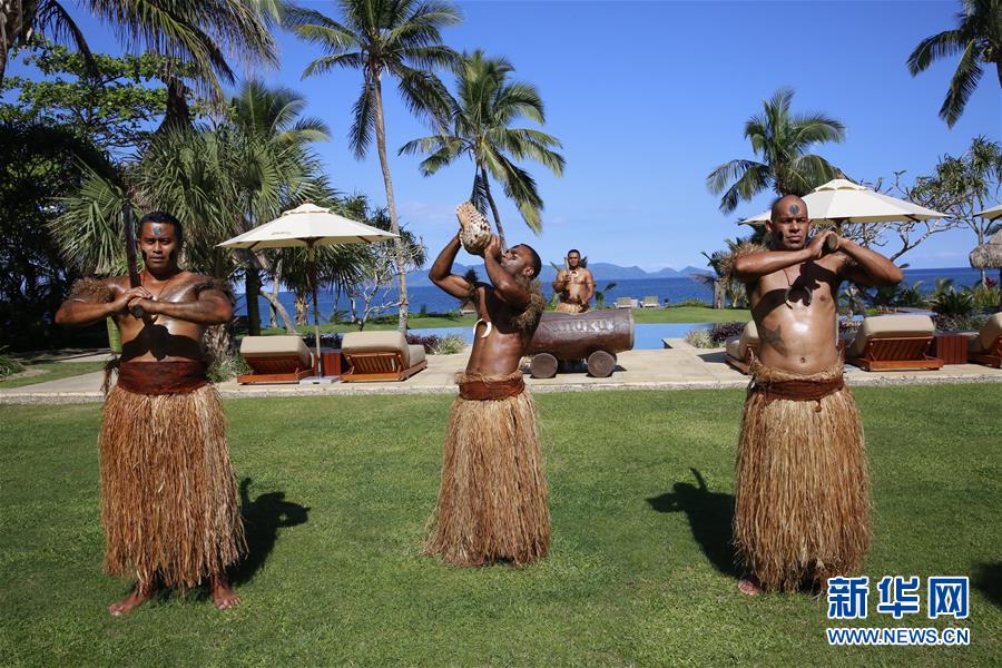 7月21日,在斐濟首都蘇瓦附近的納努庫奧博格海邊度假村,身穿草裙的斐濟“武士”為游客表演節(jié)目。新華社記者張永興攝
