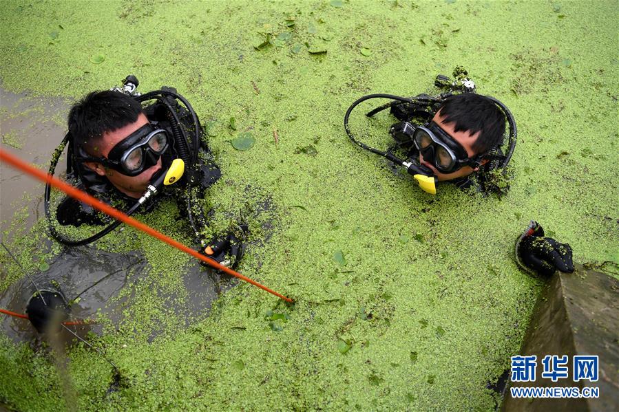7月24日,在安徽省廬江縣臺(tái)創(chuàng)園小南河段,吳正寶(左)和徐宏林準(zhǔn)備潛水。新華社記者劉軍喜攝