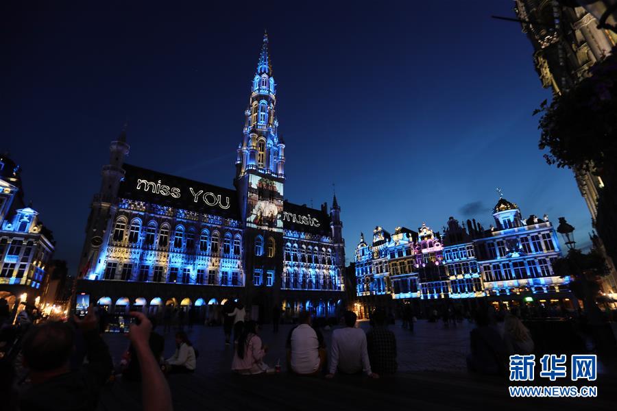 7月29日,人們?cè)诒壤麜r(shí)布魯塞爾大廣場欣賞聲光秀,市政廳外墻上投射出“想念你,音樂”的字樣。7月29日,比利時(shí)布魯塞爾大廣場舉行大型聲光秀。藝術(shù)家在市政廳等歷史建筑上投影文字和圖案,紀(jì)念這個(gè)夏天受新冠疫情影響而不能如期舉辦的文化活動(dòng)。新華社記者鄭煥松攝