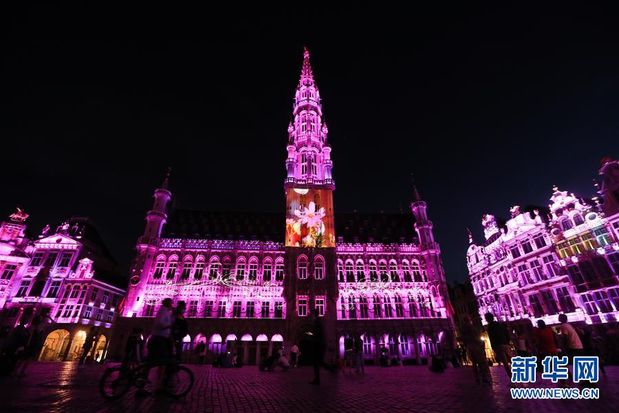 7月29日,人們在比利時布魯塞爾大廣場欣賞聲光秀,市政廳外墻上投射出鮮花地毯主題的圖案。7月29日,比利時布魯塞爾大廣場舉行大型聲光秀。藝術家在市政廳等歷史建筑上投影文字和圖案,紀念這個夏天受新冠疫情影響而不能如期舉辦的文化活動。新華社記者鄭煥松攝