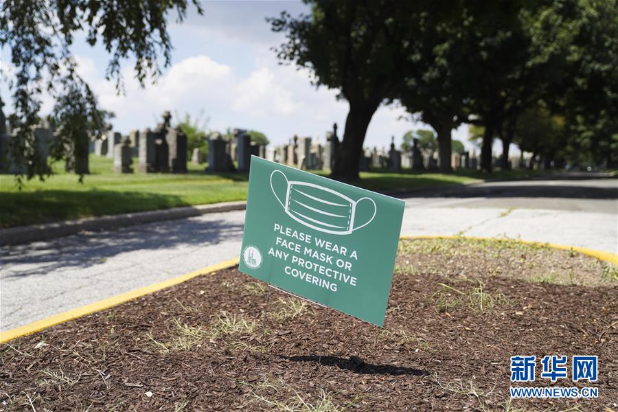 7月29日,在美國紐約一處墓地,提示牌提醒人們佩戴口罩。美國約翰斯·霍普金斯大學實時統(tǒng)計數(shù)據(jù)顯示,截至29日,美國累計新冠確診病例已超過440萬例,累計死亡病例超過15萬例。新華社記者王迎攝