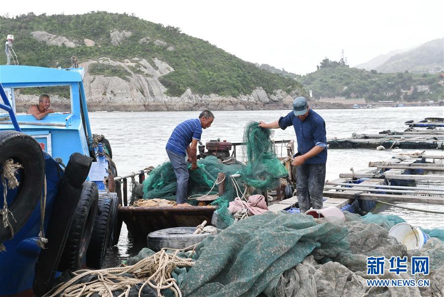 8月3日,福建霞浦縣三沙鎮(zhèn)漁民在漁排上整理漁具準(zhǔn)備上岸避風(fēng)。新華社記者林善傳攝