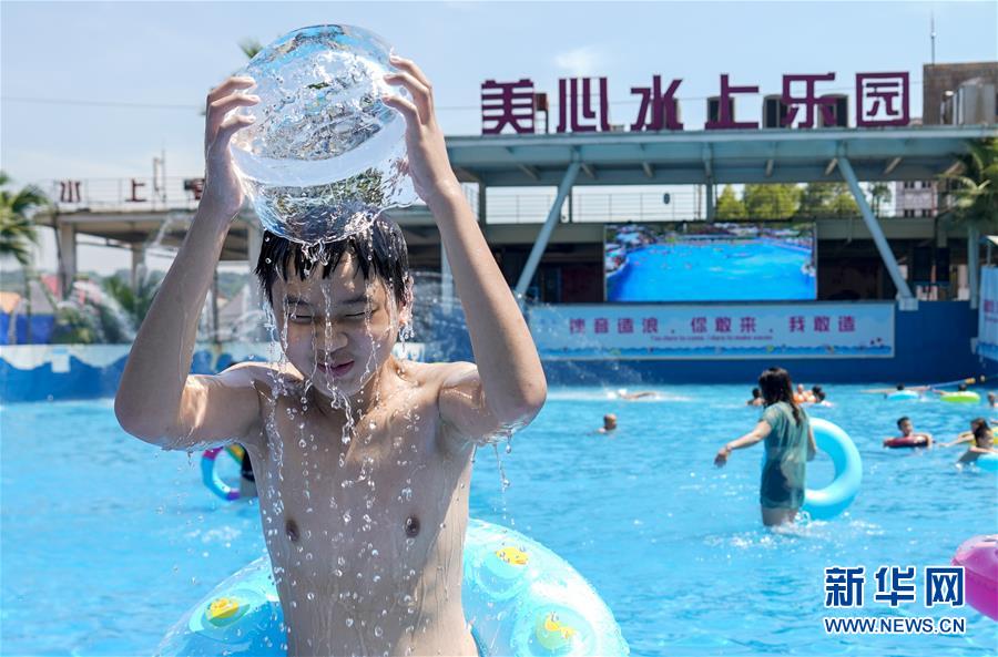 8月5日,重慶涪陵紅酒小鎮(zhèn)水上樂園內(nèi),一名游客用真冰做成的冰桶裝滿水,給自己澆水降溫。當(dāng)日,重慶市氣象臺(tái)再次發(fā)布“高溫橙色預(yù)警信號(hào)”,重慶大部分海拔400米以下地區(qū)日最高氣溫將升至37℃以上,局地可達(dá)40℃以上。許多重慶市民涌進(jìn)當(dāng)?shù)氐乃蠘穲@和泳池,在水中享受夏季的清涼。新華社記者劉潺攝