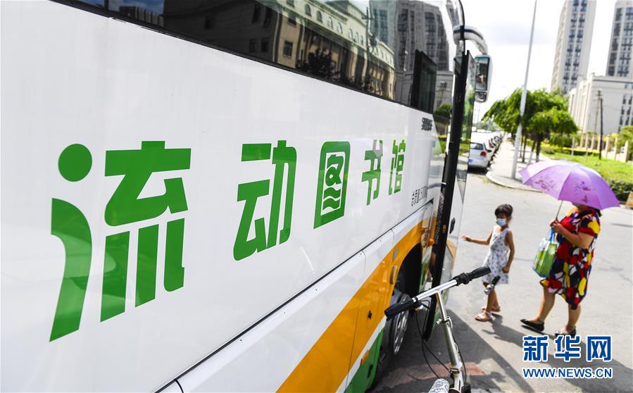 8月5日,在長春市一處社區(qū)服務(wù)點(diǎn),一名市民騎行經(jīng)過“流動圖書館”。三千冊圖書,一輛大巴車,穿梭在城市的街頭巷尾。在吉林長春,長春市圖書館利用流動圖書車,定期在市內(nèi)15個固定服務(wù)點(diǎn)間巡回流動,為市民提供便捷的圖書借閱服務(wù)。新華社記者許暢攝