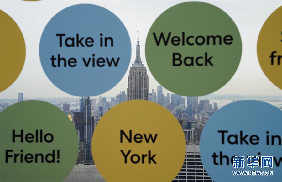這是8月6日在美國紐約洛克菲勒中心觀景臺上拍攝的城市景觀。當日,3月份暫時關閉的洛克菲勒中心觀景臺恢復對公眾開放。每天13時至21時,人們可戴口罩前往參觀。新華社記者王迎攝