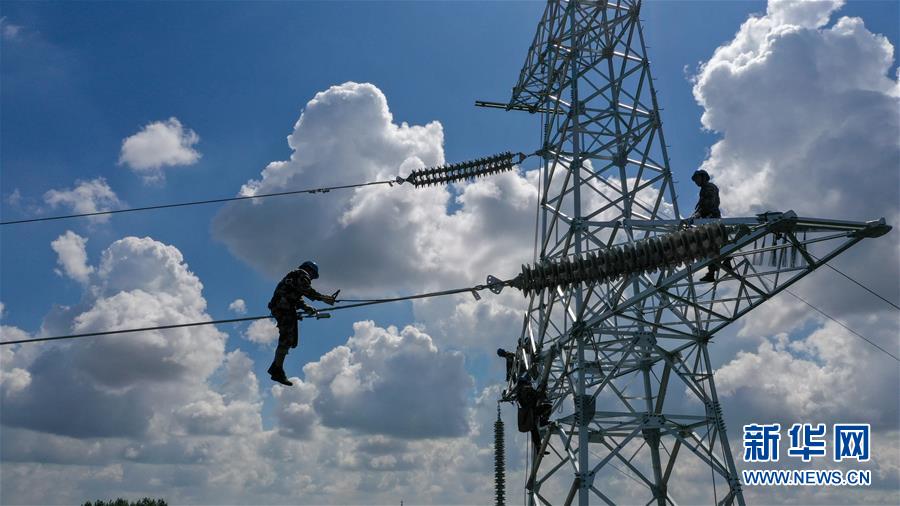 8月6日,幾名送電工在吉林省長(zhǎng)春市城郊的一處輸電鐵塔上施工作業(yè)(無(wú)人機(jī)照片)。吉林省長(zhǎng)春市連續(xù)多日出現(xiàn)高溫天氣,國(guó)網(wǎng)長(zhǎng)春供電公司輸電運(yùn)檢中心的送電工們每天清晨開始作業(yè),不畏烈日“烤”驗(yàn),堅(jiān)守工作崗位,確保工程按計(jì)劃完成。新華社記者張楠攝