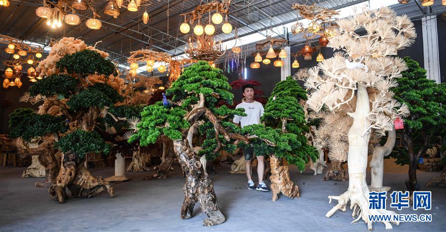 8月7日,工人利用柑橘樹枝加工吊燈飾品。2017年以來,廣西桂林市永??h永安鄉(xiāng)通過幫扶返鄉(xiāng)青年創(chuàng)業(yè)的方式,建立起根雕工藝品就業(yè)扶貧車間,組織貧困群眾進車間務工學藝,把當?shù)刎S富的朽木和柑橘樹根枝資源利用起來,加工成盆景、茶桌、吊燈等根雕工藝品,不僅幫助貧困群眾在家門口掌握一技之長,還讓他們在脫貧摘帽后實現(xiàn)穩(wěn)定增收。新華社記者張愛林攝