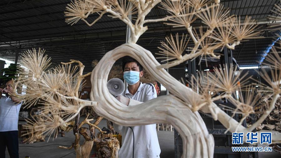 8月7日,工人在制作根雕工藝品。2017年以來(lái),廣西桂林市永福縣永安鄉(xiāng)通過(guò)幫扶返鄉(xiāng)青年創(chuàng)業(yè)的方式,建立起根雕工藝品就業(yè)扶貧車間,組織貧困群眾進(jìn)車間務(wù)工學(xué)藝,把當(dāng)?shù)刎S富的朽木和柑橘樹(shù)根枝資源利用起來(lái),加工成盆景、茶桌、吊燈等根雕工藝品,不僅幫助貧困群眾在家門口掌握一技之長(zhǎng),還讓他們?cè)诿撠氄焙髮?shí)現(xiàn)穩(wěn)定增收。新華社記者張愛(ài)林?jǐn)z