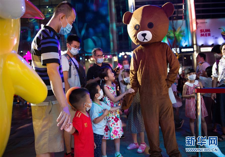 8月8日晚,小朋友在望京小街商業(yè)街與人偶互動(dòng)。新華社記者 陳鐘昊 攝