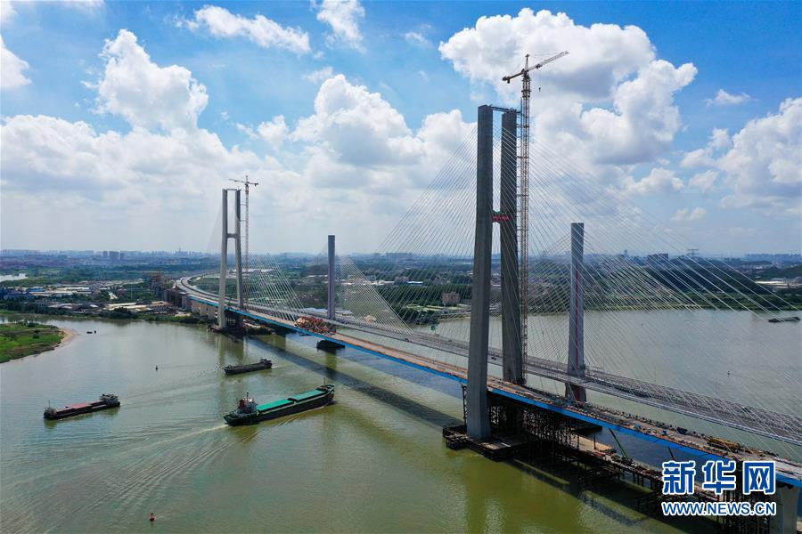 8月9日拍攝的廣州南沙港鐵路跨西江特大斜拉橋最后一塊鋼箱梁吊裝施工現(xiàn)場(無人機照片)。當(dāng)日,中鐵十一局承建的粵港澳大灣區(qū)基礎(chǔ)設(shè)施“硬聯(lián)通”重點工程——廣州南沙港鐵路跨西江特大斜拉橋完成最后一塊鋼箱梁吊裝作業(yè),大橋即將合龍。該橋位于廣東佛山市和江門市交界處,全長1117.5米。新華社記者劉大偉攝。