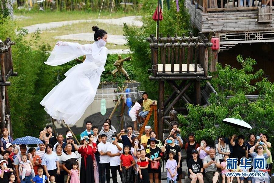 8月8日,游客在貴州省龍里縣“龍門(mén)鎮(zhèn)”武俠文化主題景區(qū)觀看武俠劇表演。近日,貴州省黔南布依族苗族自治州龍里縣境內(nèi)氣候宜人,龍里油畫(huà)大草原、“龍門(mén)鎮(zhèn)”武俠文化主題景區(qū)等景點(diǎn)吸引眾多游客前來(lái)觀光旅游。新華社記者楊文斌攝。