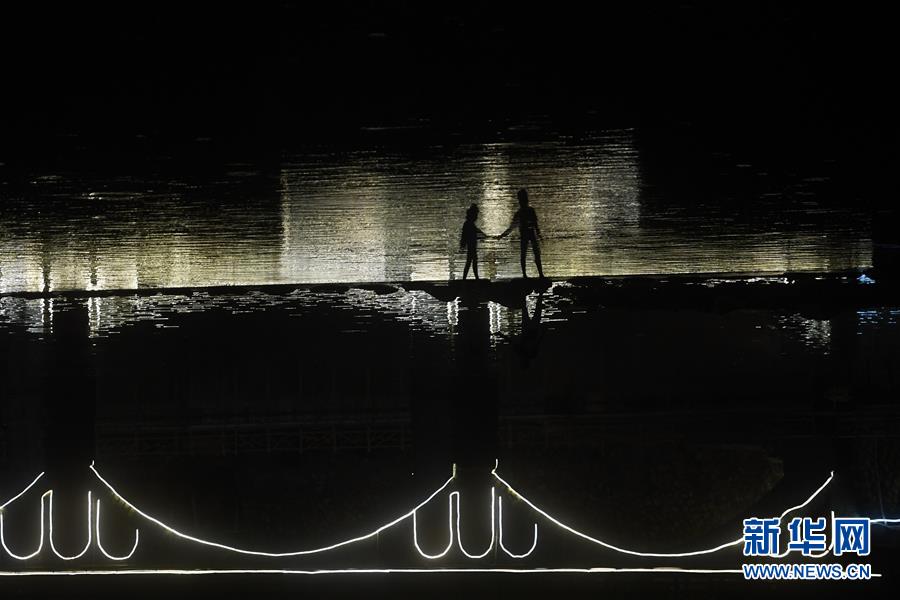夜幕降臨時,游客在下姜村的小廣場上游覽(2017年8月9日攝)。新華社記者黃宗治攝。