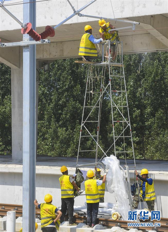 8月10日,工人在京雄城際鐵路霸州北站建設(shè)工地為接觸網(wǎng)卡定位。京雄城際鐵路霸州北站站臺(tái)雨棚混凝土結(jié)構(gòu)施工日前全部完成,目前霸州北站已全面轉(zhuǎn)入裝飾裝修和機(jī)電安裝階段,預(yù)計(jì)2020年底投入使用。京雄城際鐵路是連接北京市區(qū)、大興機(jī)場和雄安新區(qū)的重要干線。建成后,將進(jìn)一步完善京津冀區(qū)域高速鐵路網(wǎng)結(jié)構(gòu),便利沿線群眾出行,對于推動(dòng)京津冀協(xié)同發(fā)展和支撐建設(shè)雄安新區(qū)具有重要意義。新華社記者李曉果攝。